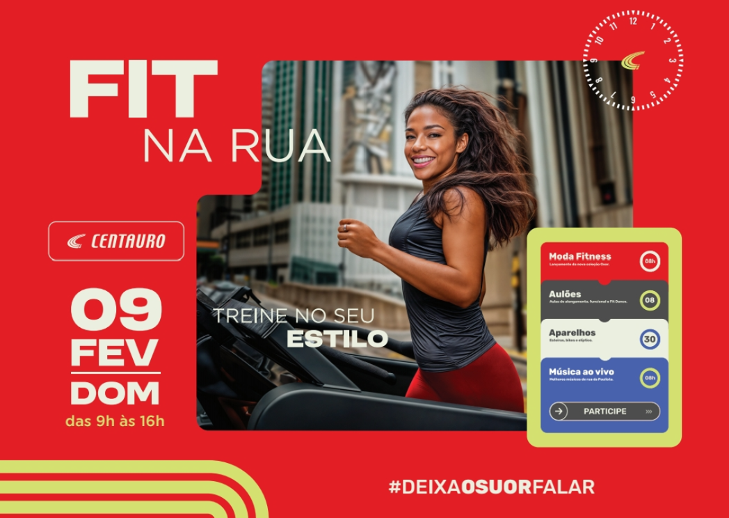 A Centauro, maior varejista de artigos esportivos da América Latina, transformará a Avenida Paulista em uma academia a céu aberto no dia 9 de fevereiro. Denominada Fit na Rua, a ação gratuita, que incentiva a prática de atividades físicas, acontecerá das 9h às 16h, em frente à entrada do Shopping Cidade São Paulo e dentro da loja da Centauro na Avenida Paulista.